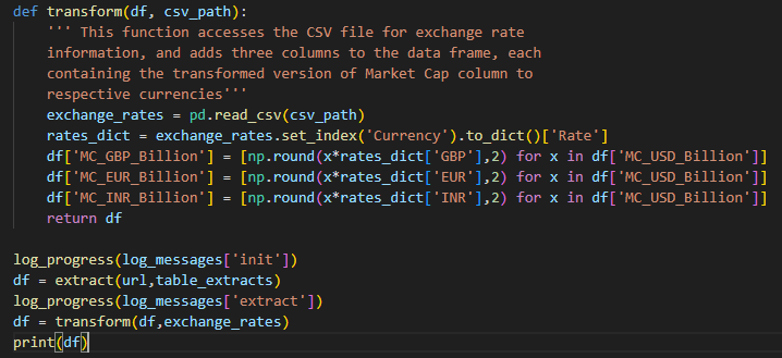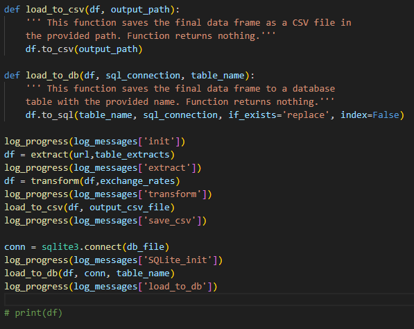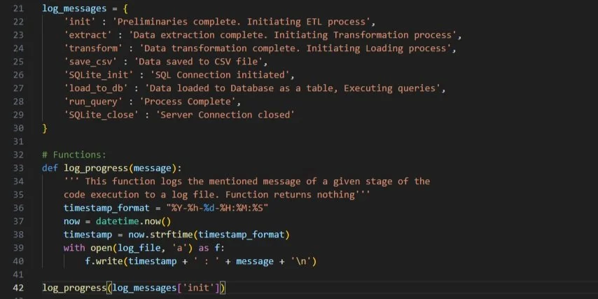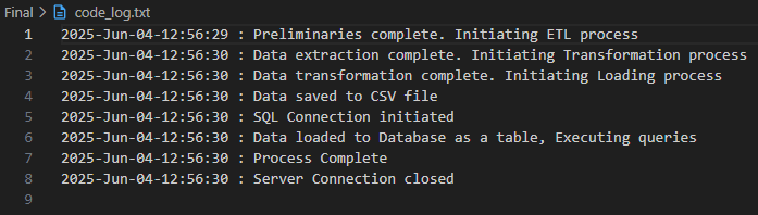 A timestamped log_progress() function tracks every stage of the ETL pipeline in a .txt file — useful for future debugging or audits.