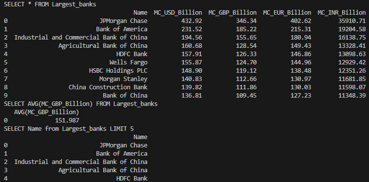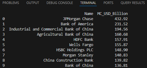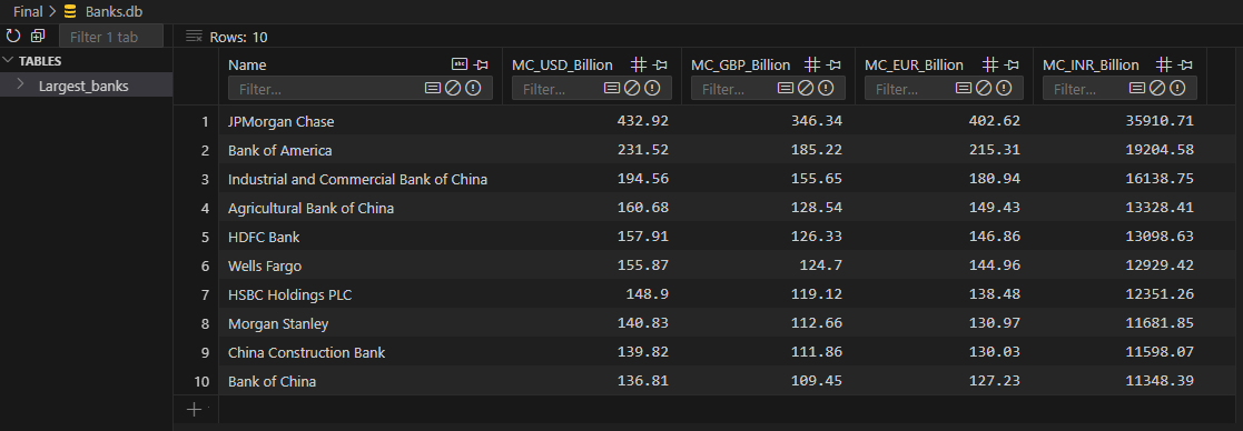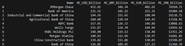 (Full dataset exported to Largest_banks_data.csv and stored in Banks.db SQLite table)